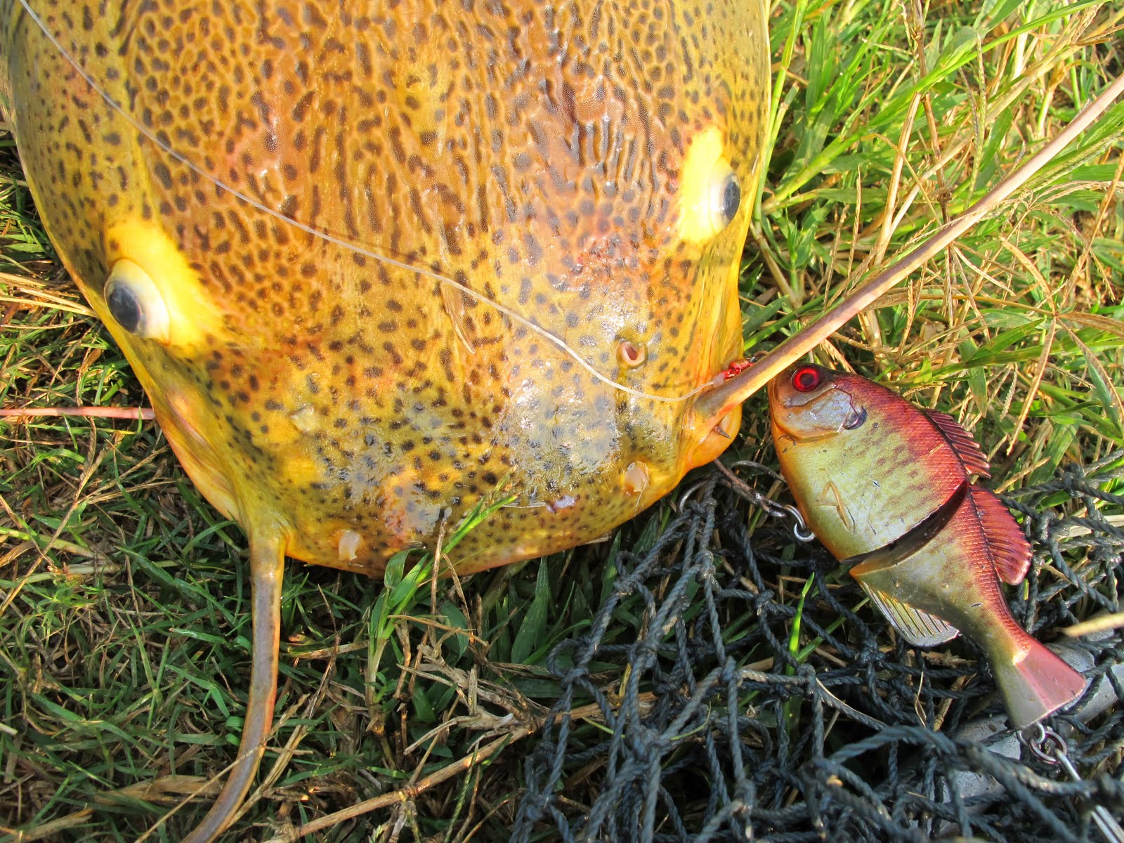 The most common catch on lure in the lake is the Amazonian Red Tail Catfish, here with a Jackall Bros Doozer in its gob...