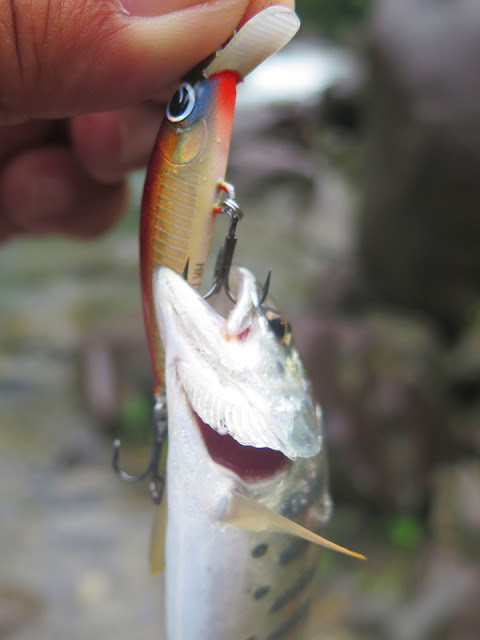 | We learnt to find ambush points to cast to. And after a little Trout which fell off the hook, this little guy ended up in the landing net... |